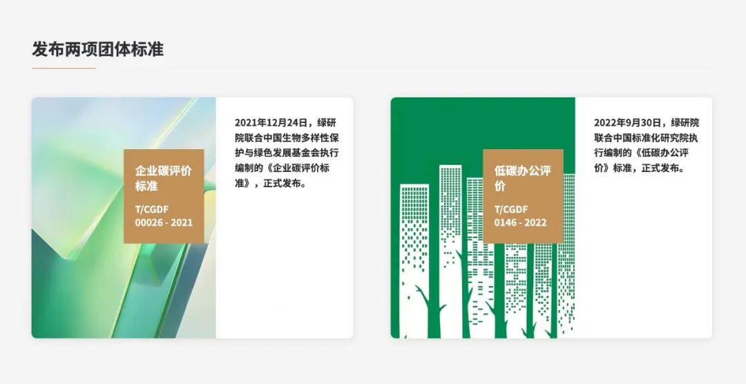 2022年6月至9月,绿研院联合中国标准化研究院,编制发布了国内首个《低碳办公评价》标准,从“制度及宣导”、“组织低碳行为”、“员工低碳行为”三个方面评价企业的低碳办公成果,同时引入了“创新评价指标”,鼓励企业开展管理创新、技术创新和文化创新,倡导低碳文化,激励员工低碳行为。