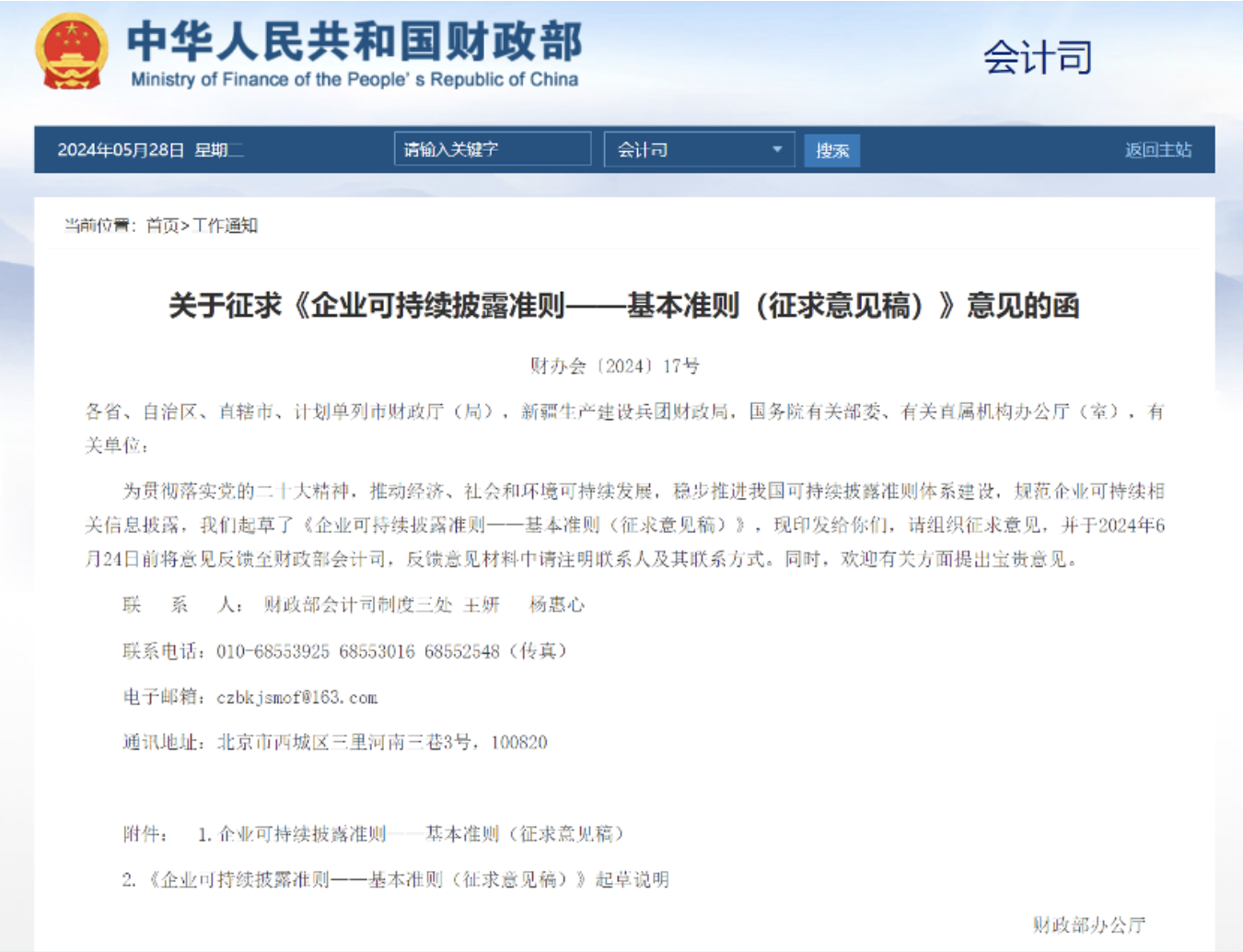 5月27日,财政部发布了《企业可持续披露准则——基本准则(征求意见稿)》以及相关的起草说明。该准则是由财政部会同外交部、国家发展改革委、工业和信息化部、生态环境部、商务部、中国人民银行、国务院国资委、金融监管总局、中国证监会等9部门成立的跨部门工作专班共同发布的。准则的制定是为了响应全球对环境、社会和治理(ESG)问题的关注,加强企业可持续信息披露,以满足投资者、债权人和监管部门等利益相关方对企业可持续信息的需求。